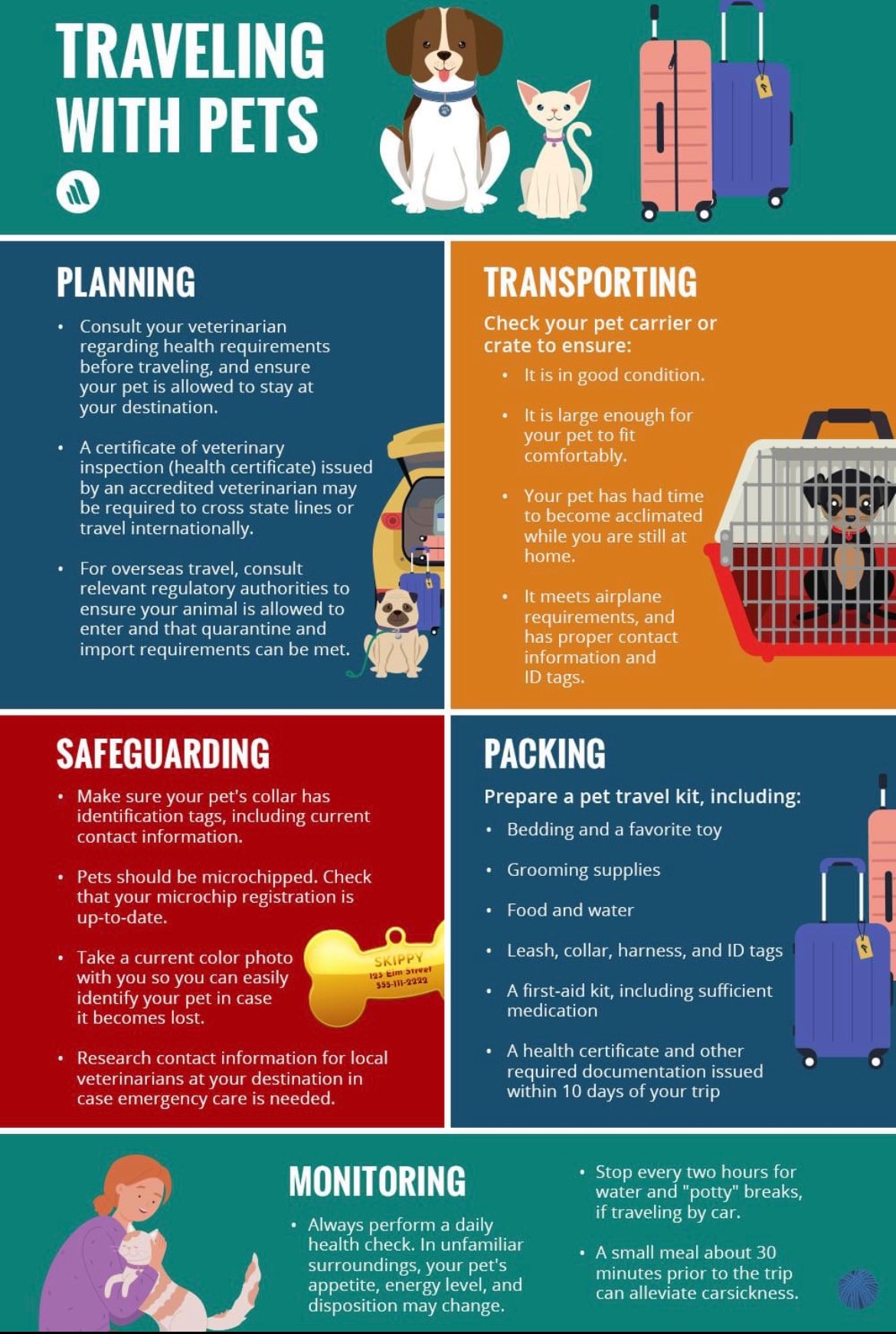 The infographic below shares great tips on planning to travel with your pet, what to pack for them, as well as transporting, safeguarding, and monitoring them during the trip!